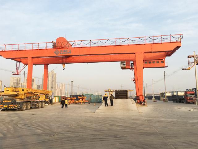 吊具的开闭锁动作和伸缩由司机在操纵室操作。同时,为了适应不同的集装箱堆放方向和集装箱拖车行走方向,集装箱吊具可设计有旋转机构,可使集装箱任意旋转,以提高装卸效率。本起重机专用于铁路货场装卸、堆放20、40及45英尺国际标准集装箱。本机配备伸缩式集装箱吊具,用于吊运不同规格集装箱。